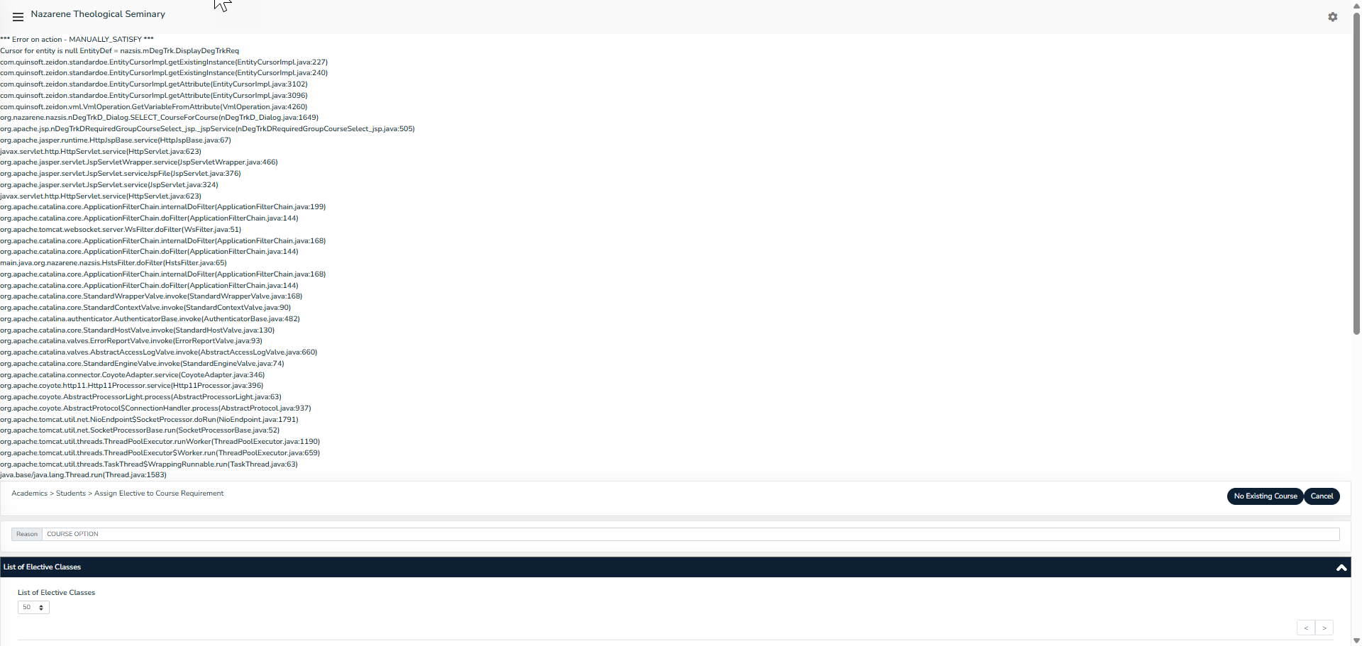I was trying to satisfy a course in the degree audit from the "List of Classes that Already Satisfy a Group" and received the attached error code. I also tried unsatisfying the class from the group it was assigned to and it wouldn't allow me to do that either.