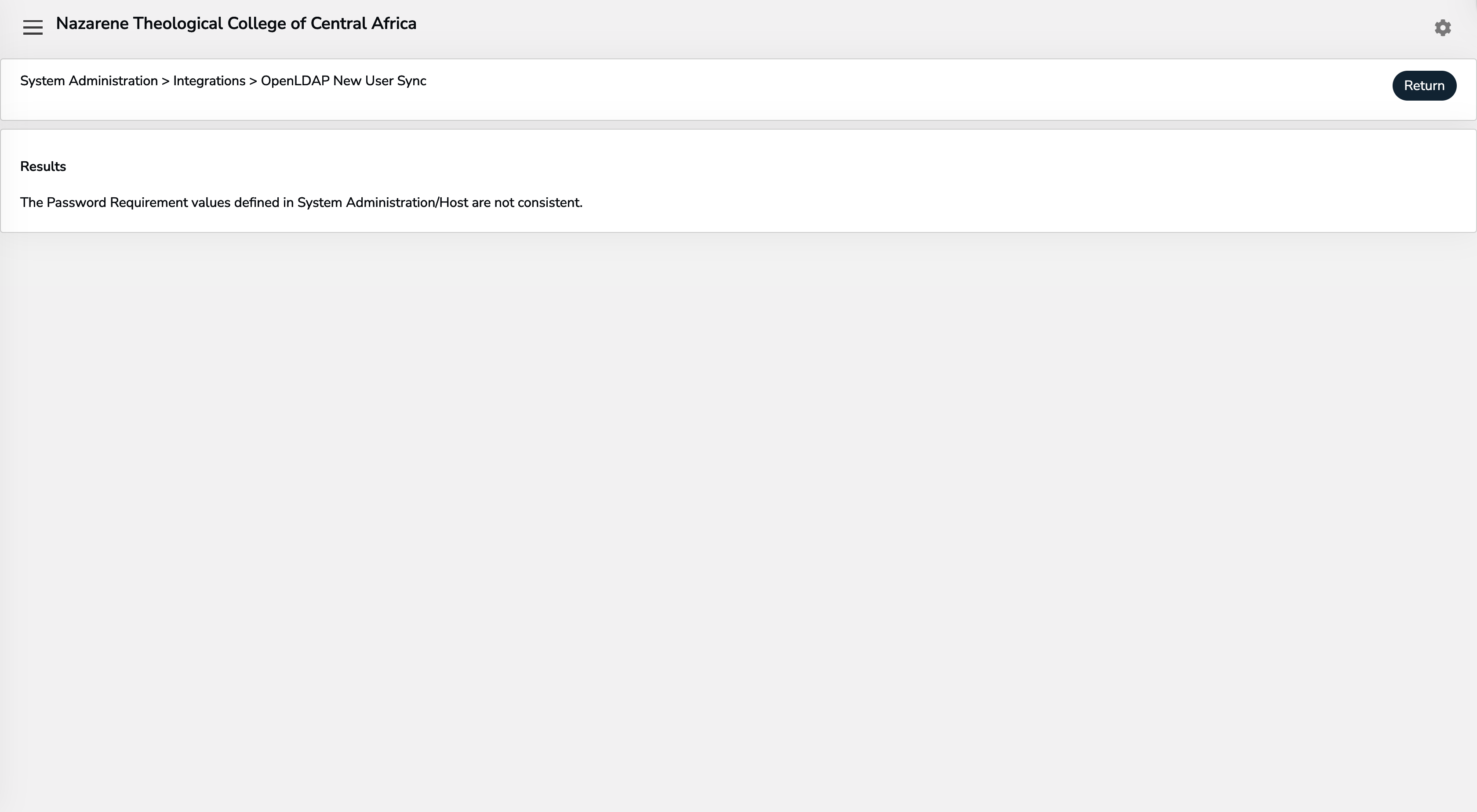 "The Password Requirement values defined in System Administration/Host are not consistent."